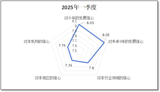针对“本行业领域的发展信心”这一指标,从业者们打出的分值为7.8分,比2024年4季度分值高出1.46分;对于“本地区检验检测行业的发展信心”指标,得分分值为7.74分,比上一季度得分高出1.34分;对“本机构的发展信心”指标得分分值也为7.74分,比上一季度高出1.16分。从这三个指标来看,2025年一季度的分值都出现了大幅度增长,从业者们对大至行业整体,小至本机构的发展前景都出现了较显著的乐观看法。