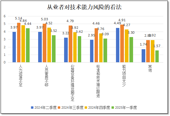 对“技术能力”、“体制机制”、“质量管理”以及“其他”等几个风险事项来说,2025年一季度的分值分别为3.52、3.72、2.94和2.06分,均较上一季度大幅下降,说明业界对这几方面风险的担忧顾虑程度均大幅缓解。