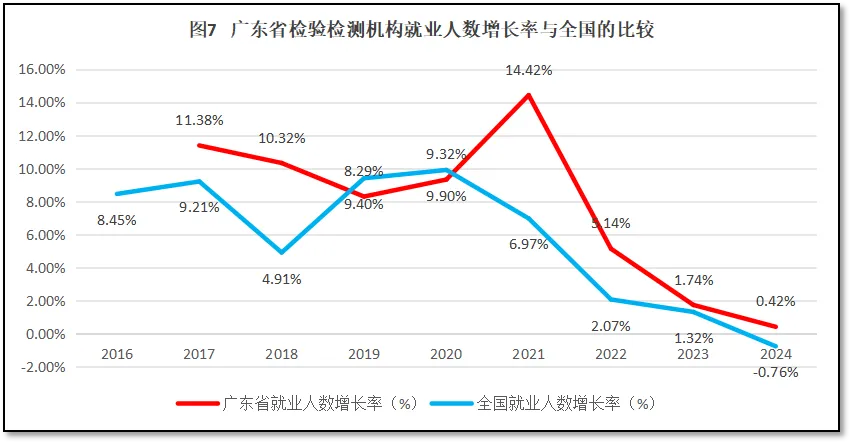 由图7可见,在2020年全国检验检测行业就业人口开始进入下降区间后,广东省检验检测行业就业人数在2021年还迎来了一个高峰期,到2022年度才开始下降,跟广东省检验检测机构数量增长率的变化规律类似,在时间上具有一定“滞后性”。而广东省检验检测行业就业人数增长率曲线最近几年虽然持续下降,但仍略高于全国平均水平,2024年还保持了正增长。