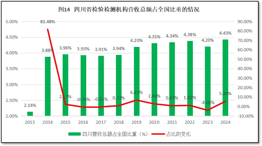 由图14可见,四川省检验检测机构营收总额在全国检验检测行业营收总额中的比重主要呈现两个发展阶段,在2013-2018年,主要在3.9%左右波动;在2019年出现一定增幅后,从2019年到2023年主要在4.3%左右波动。从增长率来看,从2015年起,四川省检验检测机构营收总额在全国检验检测行业中的占比的变化很小,过去11年的平均增幅仅有1.37%,发展比较稳健。2024年度由于四川省检验检测行业营收有较大增长,其在全行业中的贡献进一步提升。