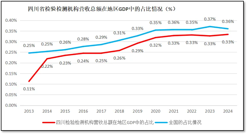 再来看四川省检验检测机构营收总额在其地区生产总值GDP中的占比情况。2024年度,四川省检验检测机构营收总额215.77亿元,占当年四川省GDP值的0.33%,低于全国平均值0.36%,排名全国第15(由高到低排序),处于全国中等水平。过去12年四川省检验检测机构营收总额在当地GDP值的比例变化情况,如图15所示。