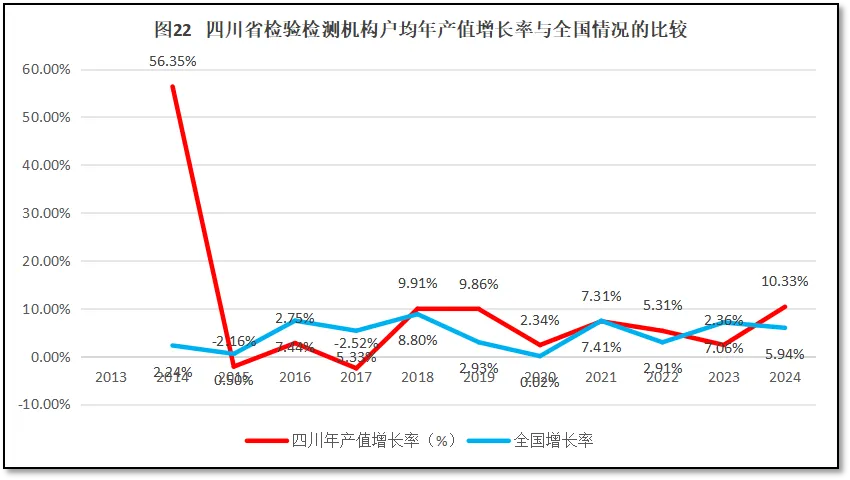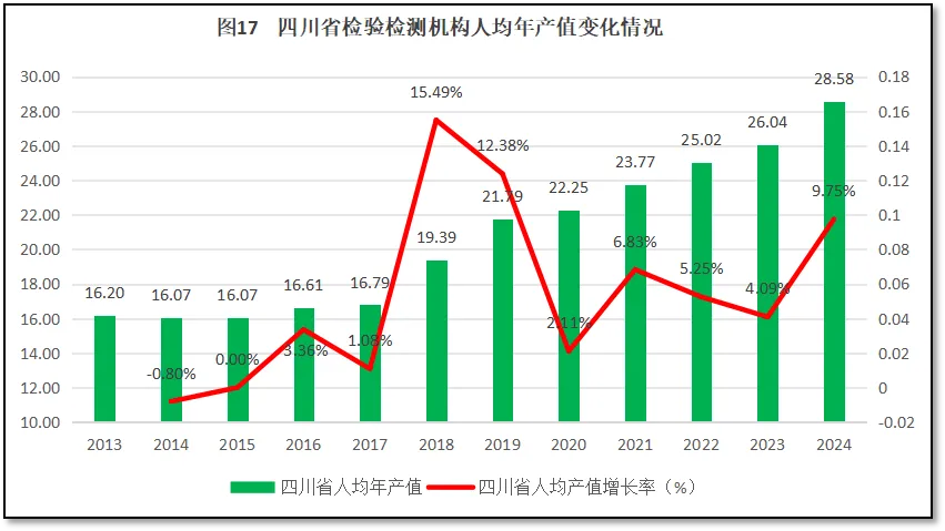 由图17可见,过去12年,四川省检验检测机构人均年产值持续保持增长,2024年达到28.58万元,是2013年的1.76倍。从增长率来看,在2018年出现一个增长峰值,年度同比增幅达到15.49%,其他年份在10%以内波动。不过,由于四川省检验检测机构人均年产值的起点低,尽管过去12年四川省检验检测机构人均年产值年均增幅达到5.41%,但至今仍未达到检验检测行业的“温饱线”。2024年,四川省检验检测机构人均年产值增幅较大,有望在未来两三年内突破温饱线,甚至超过全国平均数。