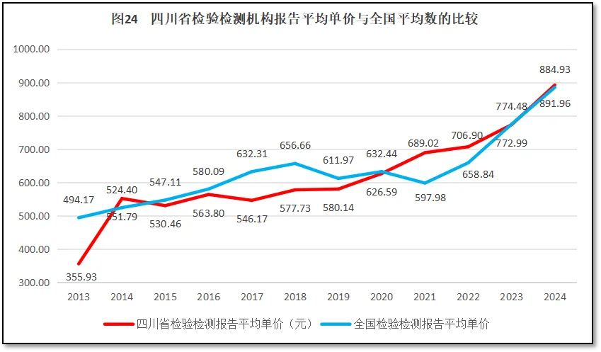 由图24可见,2020年之前,除2014年度之外,其余年份四川省检验检测报告的单价一直比全国平均水平略低,2020年之后开始高于全国平均数,但到2023年以来又与全国平均数基本持平。2024年四川省检验检测机构报告单价891.96元,排名全国第15位,与全国平均数884.93元几乎一样。可见,尽管四川省位于西部地区,经济较沿海地区略微欠发达一些,四川省检验检测机构对社会出具的检验检测报告数量也不大,但其检验检测报告单价处于全国中等水平,且2024年度的排名还提升了1位,说明四川省检验检测行业出具报告的附加值有所提升,有利于为检验检测机构增加利润。