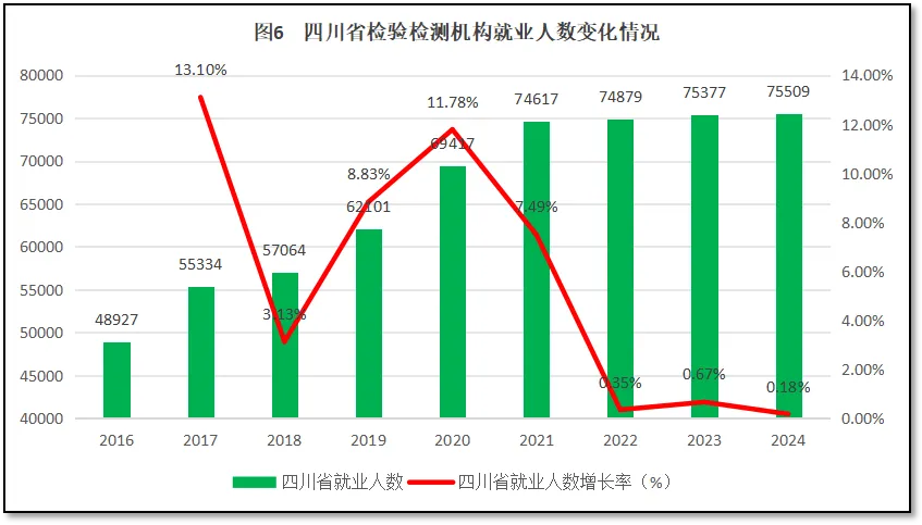 由图6可见,从2016年到2024年,四川省检验检测机就业人口数量从4.8万多人增长到7.5万多人,年均增速6.47%,总体保持增长,但2021年以来就业人数增加极微,扣除统计误差,可以说就业人数保持稳定。