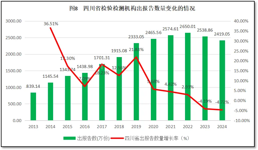 过去12年,四川省检验检测机构对外出具检验检测报告的数量如图8所示。