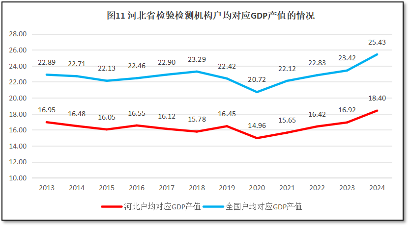 由图11可见,过去12年,河北省检验检测机构户均对应的GDP值总体变化不大,一直在16亿元左右波动,最近几年有所提升,2024年达到18.4亿元的水平,是历年来的最高值。从河北省户均对应GDP的值与全国情况进行比较可见,河北省的数值一直低于全国平均数,变动规律与全国的情况也比较一致,两者的差距也一直保持在7亿元左右,没有拉大或者缩小。这一数据变化趋势表明,近年来河北省检验检测行业发展较为平稳,与当地经济发展状态十分吻合,但因为远低于全国平均数,说明河北省检验检测机构数量相对一直较多,与当地发展需求相比显得过剩,且这种状况持续多年没有太大改变。