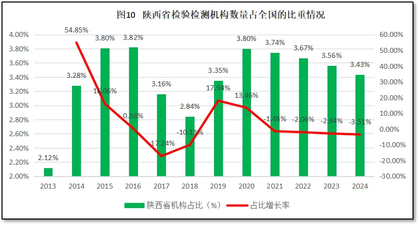 截至2024年末,陕西省检验检测机构数量为1822家,约占全国检验检测机构数量的3.43%,排名全国第9。过去12年,陕西省检验检测机构数量在全国检验检测行业中的占比以及占比的增长率,如图10所示。