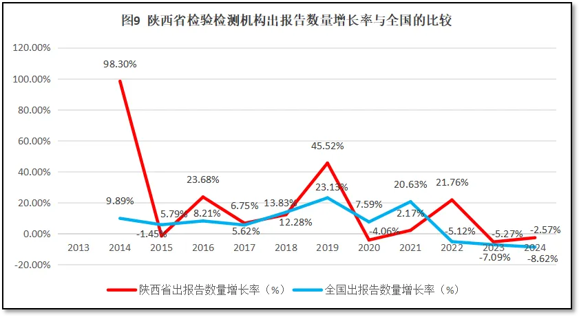 陕西省检验检测机构出具报告数量的增长率与全国检验检测机构出具报告增长率的比较,如图9所示。