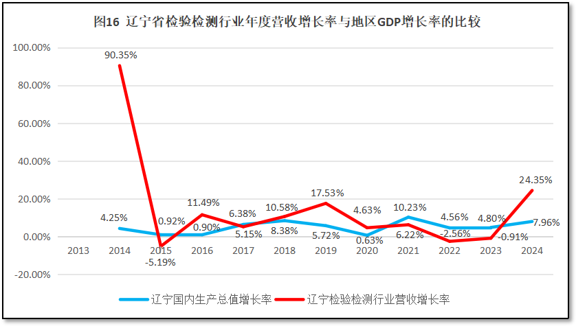 由图16可见,刨除2014年的异常数据之外,辽宁省检验检测机构年度营收总额的增长率在2015年之后总体平稳,多数年份的增幅略高于其当地GDP增长速率,年均增幅保持在7.13%左右,略高于其区域GDP5.05%的年均增速。尤其是2024年,辽宁省检验检测机构营收总额增长率很高,达到24.35%,是十年来增长幅度最大的一次。这说明相对于辽宁省经济状况,辽宁省检验检测行业发展总的来说具有领先性,发展速度略快于当地经济增长速度,虽然疫情三年因为多种原因叠加,检验检测行业发展一度落后于区域经济发展速度,但2024年的强势反弹,令人对辽宁省检验检测行业今后的快速发展充满期待。