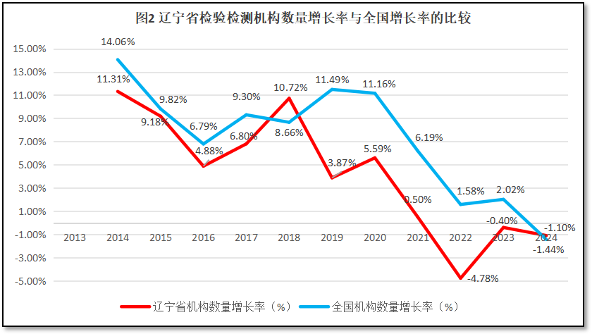 辽宁省检验检测机构数量增长率与全国检验检测机构数量的增长率进行比较,结果如图2所示。