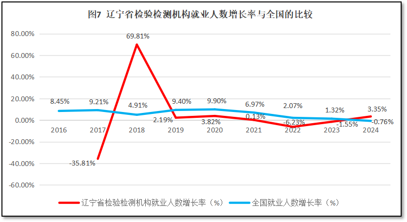 辽宁省检验检测机构就业人数增长率与全国检验检测机构就业人数增长率的比较如图7所示。